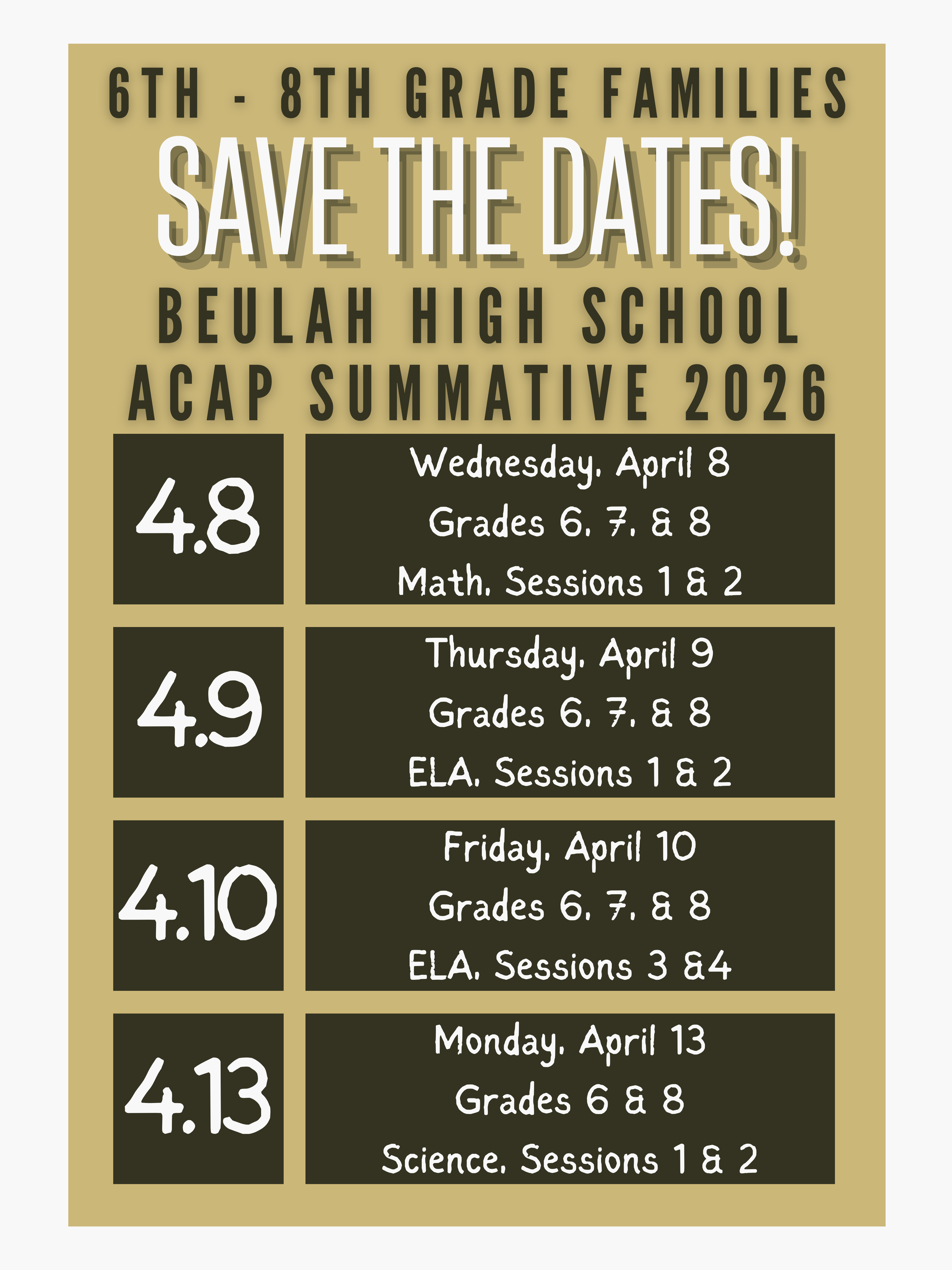 ACT Test in ONE WEEK! Dear Parents of 11th Grade Students:The ACT assessment will be given on Tuesday, March 10, which is ONE WEEK from tomorrow. We are striving for 100% of our juniors participating! We wanted to ensur... March 2, 2026